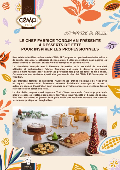 Pour célébrer les fêtes de fin d’année, Cémoi Pro propose aux professionnels des métiers de bouche, boulangerie-pâtisserie et chocolatiers, 4 idées de créations pour inspirer les professionnels et booster l’attractivité des boutiques en période festive.