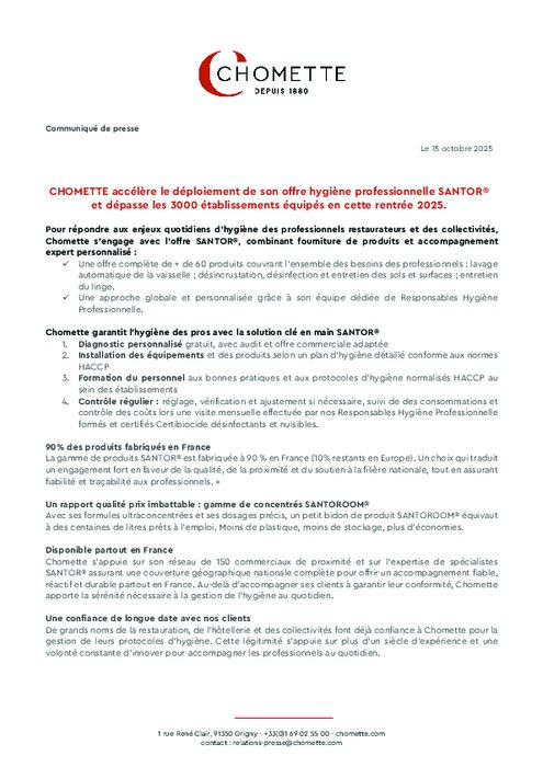 Pour répondre aux enjeux quotidiens d’hygiène des professionnels restaurateurs et des collectivités, Chomette s’engage avec l’offre Santor, combinant fourniture de produits et accompagnement expert personnalisé.