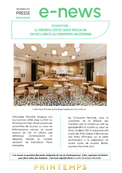 Christophe Michalak inaugure son premier coffee shop au rez-de-chaussée du Printemps Homme. Un lieu de 160 m² au design contemporain signé Marie Deroudilhe, où l’on savoure un café de spécialité BIO de la Brûlerie des Gobelins, une carte sucrée et une carte salée, à toute heure de la journée.