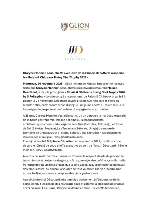 Glion Institut de Hautes Études annonce avec fierté que Claryce Monnier, sous-cheffe executive du restaurant Maison Décotterd, a reçu le prestigieux « Relais & Châteaux Rising Chef Trophy 2026 by S.Pellegrino » lors du congrès international de Relais & Châteaux organisé à Boston le 24 novembre. Décernée devant plus de 600 hôteliers et chefs du monde entier, cette récompense distingue une jeune cheffe au talent rare, à la fois exigeante, inspirée et profondément engagée dans son métier.