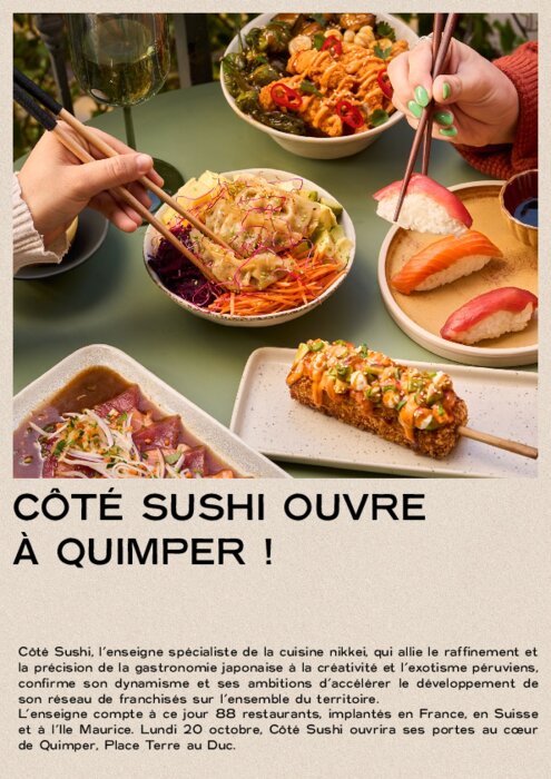 Côté Sushi, l’enseigne spécialiste de la cuisine nikkei, qui allie le raffinement et la précision de la gastronomie japonaise à la créativité et l’exotisme péruviens, confirme son dynamisme et ses ambitions d’accélérer le développement de son réseau de franchisés sur l’ensemble du territoire.