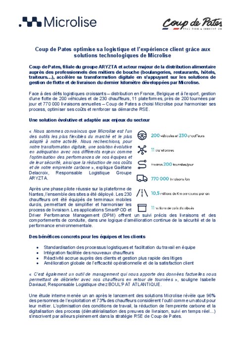 Face à des défis logistiques croissants – distribution en France, Belgique et à l’export, gestion d’une flotte de 200 véhicules et de 230 chauffeurs, 11 plateformes, près de 200 tournées par jour et 770 000 livraisons annuelles – Coup de Pates a choisi Microlise pour harmoniser ses process, optimiser ses coûts et renforcer sa démarche RSE.