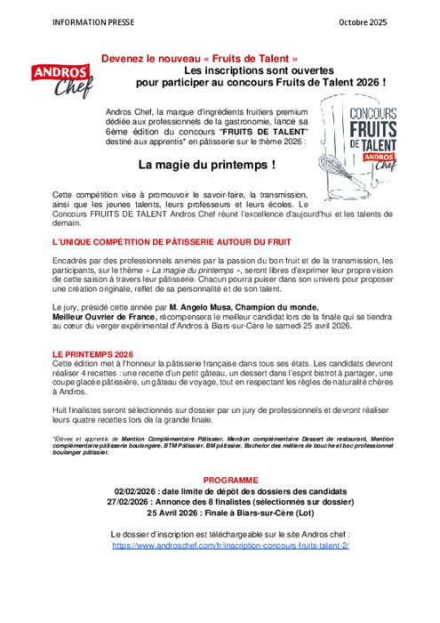 Métiers 16 octobre 2025 - 14:00 Cette compétition vise à promouvoir le savoir-faire, la transmission, ainsi que les jeunes talents, leurs professeurs et leurs écoles. Le Concours Fruits de Talent Andros Chef réunit l’excellence d’aujourd’hui et les talents de demain. PDF (171 Ko) Télécharger