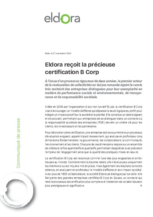 À l’issue d’un processus rigoureux de deux années, le premier acteur de la restauration de collectivités en Suisse romande rejoint le cercle très restreint des entreprises distinguées pour leur exemplarité en matière de performance sociale et environnementale, de transparence et de responsabilité sociétale.
