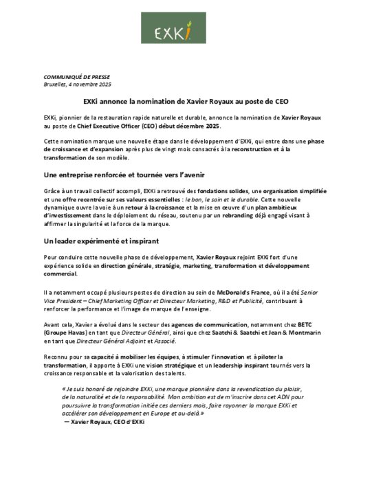 Snacking 04 novembre 2025 - 10:37 Cette nomination marque une nouvelle étape dans le développement d’Exki, qui entre dans une phase de croissance et d’expansion après plus de vingt mois consacrés à la reconstruction et à la transformation de son modèle. PDF (249 Ko) Télécharger