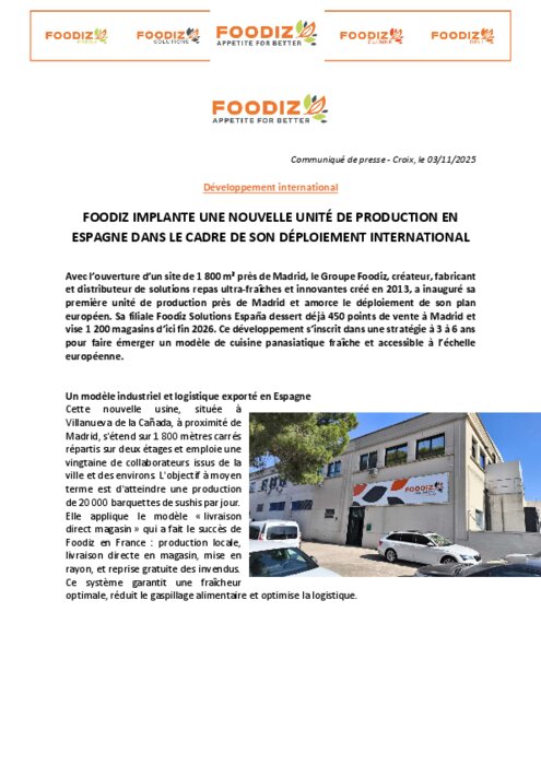 Avec l’ouverture d’un site de 1 800 m² près de Madrid, le Groupe Foodiz, créateur, fabricant et distributeur de solutions repas ultra-fraîches et innovantes créé en 2013, a inauguré sa première unité de production près de Madrid et amorce le déploiement de son plan européen. Sa filiale Foodiz Solutions España dessert déjà 450 points de vente à Madrid et vise 1 200 magasins d’ici fin 2026. Ce développement s’inscrit dans une stratégie à 3 à 6 ans pour faire émerger un modèle de cuisine panasiatique fraîche et accessible à l’échelle européenne.