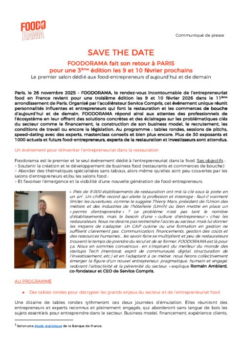 Foodorama, le rendez-vous incontournable de l’entrepreneuriat food en France revient pour une troisième édition les 9 et 10 février 2026 dans le 11e arrondissement de Paris. Organisé par l’accélérateur Service Compris, cet événement unique réunit personnalités influentes et entrepreneurs qui font la restauration et les commerces de bouche d’aujourd’hui et de demain. FOODORAMA répond ainsi aux attentes des professionnels de l’écosystème en leur offrant des solutions concrètes et des éclairages sur les problématiques clés du secteur comme le financement, la construction de son business model, le recrutement, les conditions de travail ou encore la législation. Au programme : tables rondes, sessions de pitchs, speed-dating avec des experts, masterclass conseils et bien plus encore. Plus de 30 exposants et 1000 actuels et futurs food-entrepreneurs, experts de la restauration et investisseurs sont attendus.