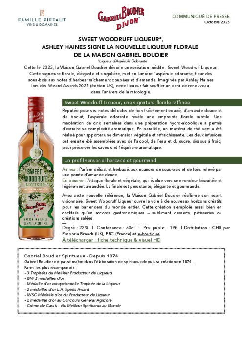 Cette fin 2025, la Maison Gabriel Boudier dévoile une création inédite : Sweet Woodruff Liqueur. Cette signature florale, élégante et singulière, met en lumière l’aspérule odorante, fleur des sous-bois aux notes d’herbes fraîchement coupées et d’amande. Imaginée par Ashley Haines lors des Wizard Awards 2025 (édition UK), cette liqueur fait souffler un vent de renouveau dans l’univers de la mixologie.