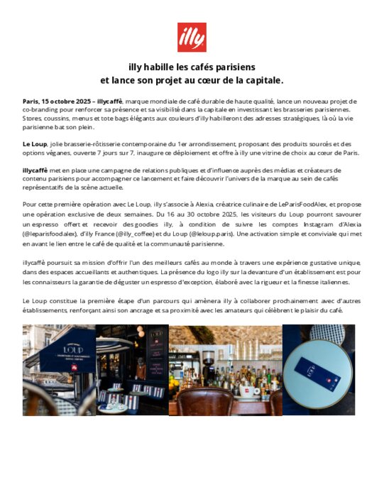 illycaffè, marque mondiale de café durable de haute qualité, lance un nouveau projet de co-branding pour renforcer sa présence et sa visibilité dans la capitale en investissant les brasseries parisiennes. Stores, coussins, menus et tote bags élégants aux couleurs d’illy habilleront des adresses stratégiques, là où la vie parisienne bat son plein.