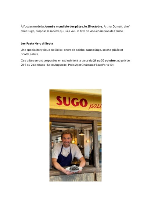 Restauration commerciale 20 octobre 2025 - 09:06 À l’occasion de la Journée mondiale des pâtes, le 25 octobre, Arthur Dumait, chef chez Sugo, propose la recette qui lui a valu le titre de vice-champion de France : Les Pasta Nero di Sepia. PDF (185 Ko) Télécharger credit Sugo