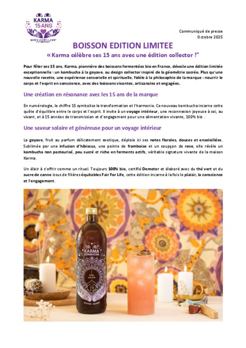 Pour fêter ses 15 ans, Karma, pionnière des boissons fermentées bio en France, dévoile une édition limitée exceptionnelle : un kombucha à la goyave, au design collector inspiré de la géométrie sacrée. Plus qu’une nouvelle recette, une expérience sensorielle et spirituelle, fidèle à la philosophie de la marque : nourrir le corps et l’esprit en conscience, avec des boissons vivantes, artisanales et engagées.