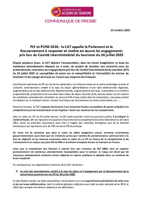 Depuis plusieurs jours, la CAT déplore l’accumulation, dans les textes budgétaires et dans les nombreux amendements déposés ou à venir, de projets de taxation non concertés avec les professionnels, contraires aux engagements pris lors du Comité interministériel du tourisme (CIT) du 24 juillet 2025 et susceptibles de peser sur la compétitivité et l’attractivité du secteur du tourisme et du voyage ainsi que sur l’accès aux vacances des Français