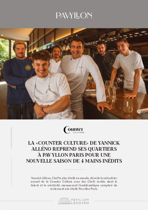 Restauration commerciale 07 octobre 2025 - 16:19 Yannick Alléno, chef le plus étoilé au monde, dévoile le calendrier annuel de la Counter Culture avec des chefs invités dont le talent et la créativité marqueront l’emblématique comptoir du restaurant une étoile Pavyllon Paris. PDF (2 Mo) Télécharger Crédit photo : Pavyllon