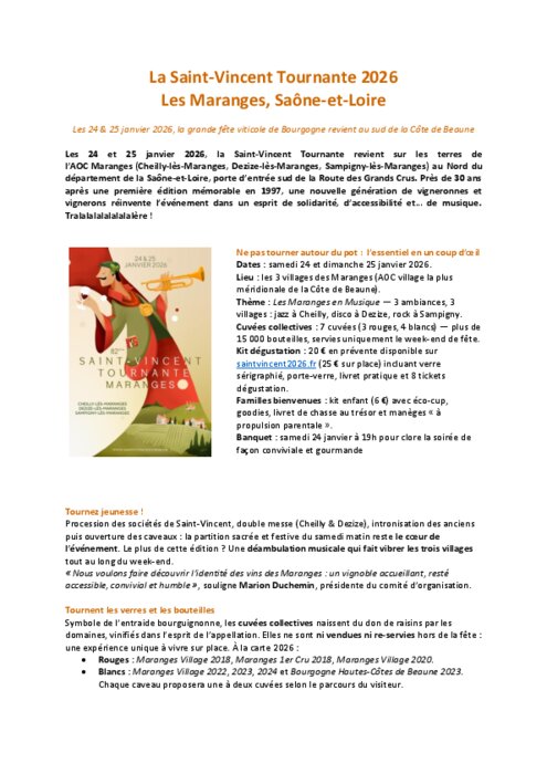 Les 24 et 25 janvier, la Saint-Vincent Tournante revient sur les terres de l’AOC Maranges (Cheilly-lès Maranges, Dezize-lès-Maranges, Sampigny-lès-Maranges) au Nord du département de la Saône-et-Loire, porte d’entrée sud de la Route des Grands Crus. Près de 30 ans après une première édition mémorable en 1997, une nouvelle génération de vigneronnes et vignerons réinvente l’événement dans un esprit de solidarité, d’accessibilité et… de musique.
