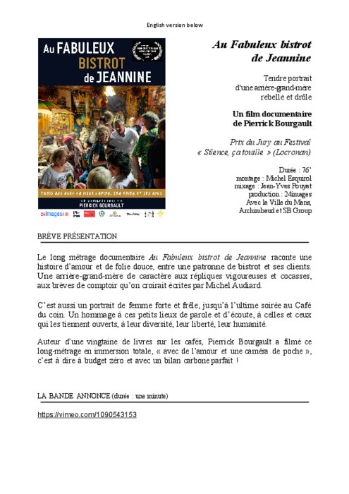Le long métrage documentaire Au Fabuleux bistrot de Jeannine raconte une histoire d’amour et de folie douce, entre une patronne de bistrot et ses clients. Une arrière-grand-mère de caractère aux répliques vigoureuses et cocasses,