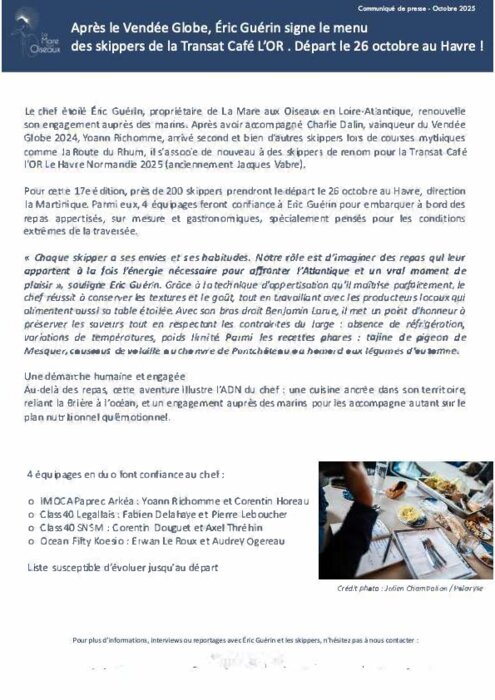 Le chef étoilé Éric Guérin met les voiles avec la gastronomie en signant les menus de plusieurs skippers engagés dans la Transat Café de l'Or. Entre technicité et raffinement, il propose une cuisine adaptée aux contraintes de la course au large. Chaque plat a été pensé pour conjuguer énergie, plaisir et conservation. Une manière d’embarquer un peu d’excellence culinaire au cœur de l’Atlantique.