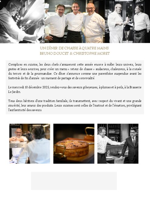 Complices en cuisine, les chefs Bruno Doucet et Christophe Moret s’amuseront cette année encore à mêler leurs univers, leurs gestes et leurs sourires, pour créer un menu « retour de chasse » audacieux, chaleureux, à la croisée du terroir et de la gourmandise. Ce dîner s’annonce comme une parenthèse suspendue avant les festivités de fin d’année : un moment de partage et de convivialité.