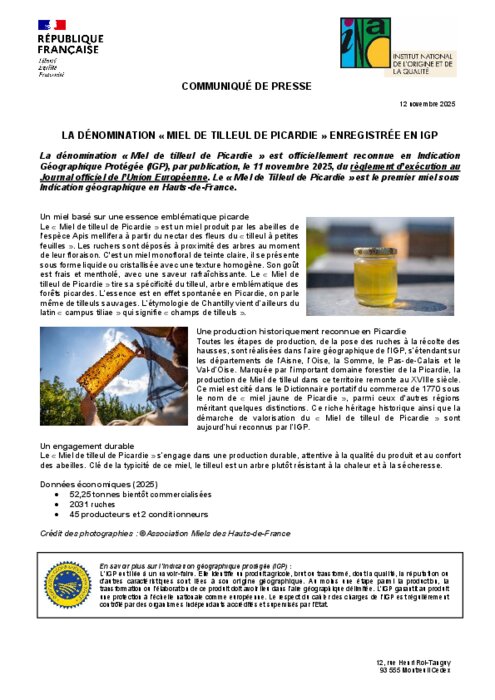 Le « Miel de tilleul de Picardie » est un miel produit par les abeilles de l'espèce Apis mellifera à partir du nectar des fleurs du « tilleul à petites feuilles ». Les ruchers sont déposés à proximité des arbres au moment de leur floraison. C'est un miel monofloral de teinte claire, il se présente sous forme liquide ou cristallisée avec une texture homogène. Son goût est frais et mentholé, avec une saveur rafraîchissante.