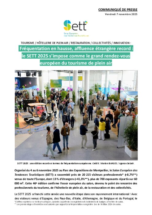 Organisé du 4 au 6 novembre au Parc des Expositions de Montpellier, le Salon Européen des Tendances Touristiques (SETT) a rassemblé près de 20 215 visiteurs professionnels (+8,7%) venus de toute l’Europe, dont 13 % d’étrangers (+41,3%), plus de 700 exposants répartis sur 60 000 m². Cette 46ᵉ édition confirme l’essor européen du salon, devenu le point de rencontre des professionnels du tourisme, de l’hôtellerie de plein air, de la restauration et des collectivités.