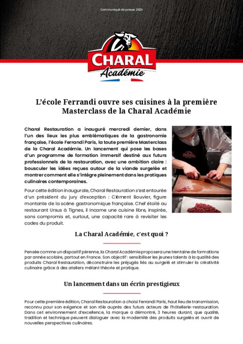 Charal Restauration a inauguré mercredi dernier, dans l’un des lieux les plus emblématiques de la gastronomie française, l’école Ferrandi Paris, la toute première Masterclass de la Charal Académie. Un lancement qui pose les bases d’un programme de formation immersif destiné aux futurs professionnels de la restauration, avec une ambition claire : bousculer les idées reçues autour de la viande surgelée et montrer comment elle s’intègre pleinement dans les pratiques culinaires contemporaines.