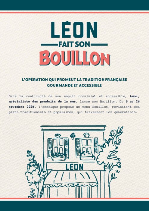 Dans la continuité de son esprit convivial et accessible, Léon, spécialiste des produits de la mer, lance son Bouillon. Du 5 au 26 novembre, l’enseigne propose un menu Bouillon, revisitant des plats traditionnels et populaires, qui traversent les générations.