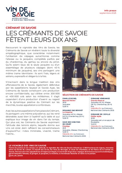 S’inscrivant dans la longue tradition des vins effervescents de la Savoie, également défendue par les appellations Seyssel et Savoie Ayze, les Crémants de Savoie constituent une production encore confidentielle, qui s’élève entre 300 000 et 400 000 cols selon les millésimes. Il s’agit cependant d’une production d’avenir au regard de la dynamique positive du Crémant sur les marchés, toutes appellations confondues.