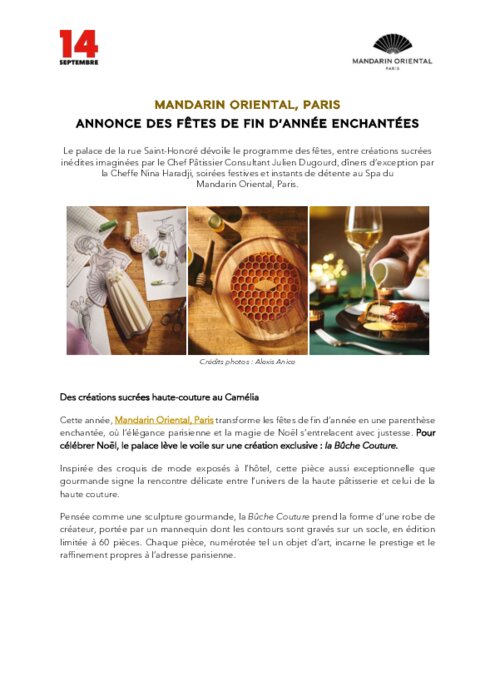 Cette année, Mandarin Oriental, Paris transforme les fêtes de fin d’année en une parenthèse enchantée, où l’élégance parisienne et la magie de Noël s’entrelacent avec justesse. Pour célébrer Noël, le palace lève le voile sur une création exclusive : la Bûche Couture.