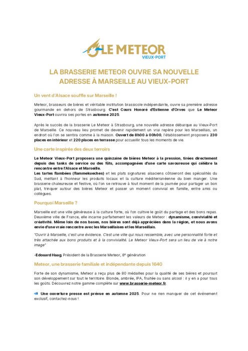 Restauration commerciale 09 octobre 2025 - 14:30 Meteor, brasseurs de bières et véritable institution brassicole indépendante, ouvre sa première adresse gourmande en dehors de Strasbourg. C’est Cours Honoré d’Estienne d’Orves que Le Meteor Vieux‑Port ouvrira ses portes en automne 2025. PDF (126 Ko) Télécharger