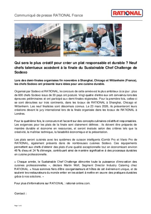 Organisé par Sodexo et Rational, le concours Sustainable Chef Challenge Sodexo de cette année est le plus ambitieux à ce jour : plus de 600 chefs Sodexo issus de 30 pays ont postulé. Vingt-quatre d’entre eux ont convaincu lors des épreuves préliminaires et ont participé aux demi-finales régionales. Pour la première fois, celles-ci se sont déroulées sur trois continents, dans les locaux de Rational à Shanghai, Chicago et Wittenheim. Les neuf finalistes sont désormais connus. Qui sera le plus créatif pour créer un plat responsable et durable ?