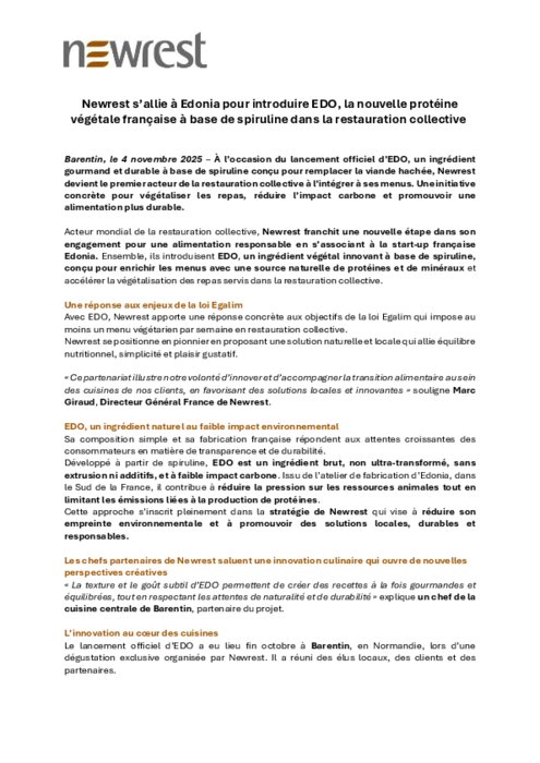 À l’occasion du lancement officiel d’Edo, un ingrédient gourmand et durable à base de spiruline conçu pour remplacer la viande hachée, Newrest devient le premier acteur de la restauration collective à l’intégrer à ses menus. Une initiative concrète pour végétaliser les repas, réduire l’impact carbone et promouvoir une alimentation plus durable.