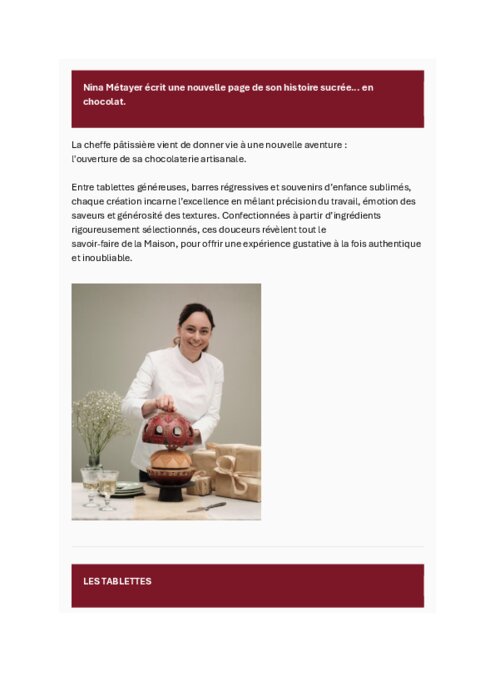 Entre tablettes généreuses, barres régressives et souvenirs d’enfance sublimés, chaque création incarne l’excellence en mêlant précision du travail, émotion des saveurs et générosité des textures. Confectionnées à partir d’ingrédients rigoureusement sélectionnés, ces douceurs révèlent tout le savoir-faire de la Maison, pour offrir une expérience gustative à la fois authentique et inoubliable.