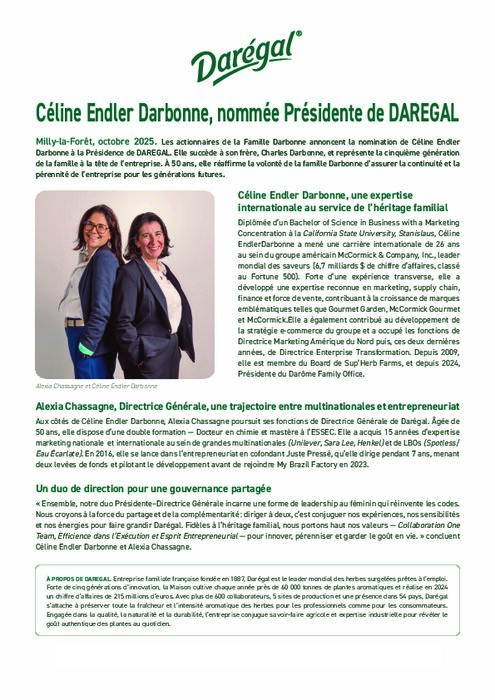 Les actionnaires de la Famille Darbonne annoncent la nomination de Céline Endler Darbonne à la présidence de Darégal. Elle succède à son frère, Charles Darbonne, et représente la cinquième génération de la famille à la tête de l’entreprise. À 50 ans, elle réaffirme la volonté de la famille Darbonne d’assurer la continuité et la pérennité de l’entreprise pour les générations futures.