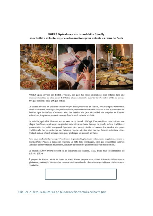 Noura Opéra innove avec un brunch résolument **Kids Friendly**, alliant gastronomie libanaise et convivialité familiale. Chaque dimanche, les enfants profitent d’un espace dédié avec animations, pendant que les parents savourent un moment de détente. Une formule gourmande et ludique pensée pour petits et grands. Une adresse à découvrir en plein cœur de Paris.