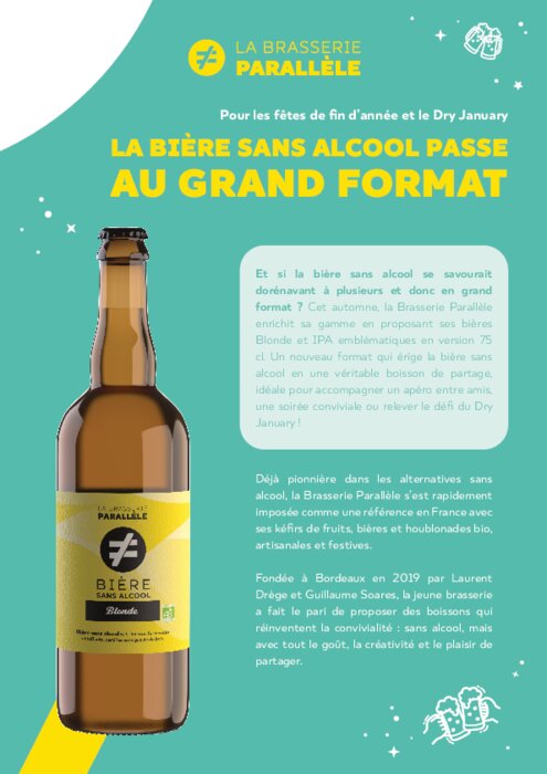 Cet automne, la Brasserie Parallèle enrichit sa gamme en proposant ses bières Blonde et IPA emblématiques en version 75 cl. Un nouveau format qui érige la bière sans alcool en une véritable boisson de partage, idéale pour accompagner un apéro entre amis, une soirée conviviale ou relever le défi du Dry January !