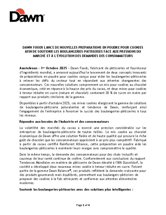Dawn Foods, fabricant de pâtisseries et fournisseur d’ingrédients mondial, a annoncé aujourd'hui le lancement de deux concepts innovants de préparations en poudre pour cookies conçus pour aider les boulangeries-pâtisseries à relever les défis du secteur tout en répondant aux attentes changeantes des consommateurs. Ces nouvelles solutions comprennent un mix pour cookies au chocolat économique, créé en réponse à la hausse des prix du cacao, et deux mixes pour cookies à teneur réduite en sucre (nature et chocolat) contenant 30 % de sucre en moins par rapport aux produits similaires de la gamme.