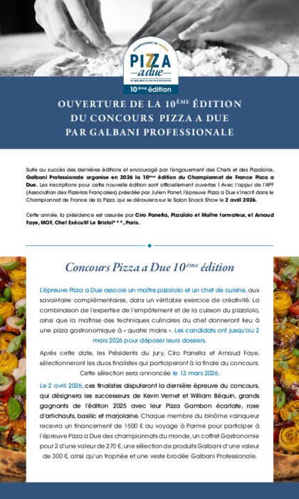 Suite au succès des dernières éditions et encouragé par l’engouement des Chefs et des Pizzaïolos, Galbani Professionale organise en 2026 la 10e édition du Championnat de France Pizza a Due. Les inscriptions pour cette nouvelle édition sont officiellement ouvertes ! Avec l’appui de l’APF (Association des Pizzerias Françaises) présidée par Julien Panet, l’épreuve Pizza a Due s’inscrit dans le Championnat de France de la Pizza, qui se déroulera sur le Salon Snack Show le 2 avril 2026.