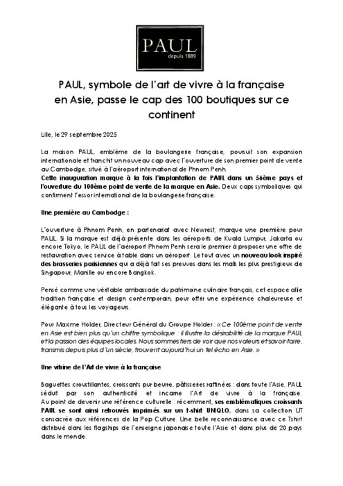 Snacking 29 septembre 2025 - 09:38 La maison Paul, emblème de la boulangerie française, poursuit son expansion internationale et franchit un nouveau cap avec l’ouverture de son premier point de vente au Cambodge, situé à l’aéroport international de Phnom Penh. PDF (331 Ko) Télécharger