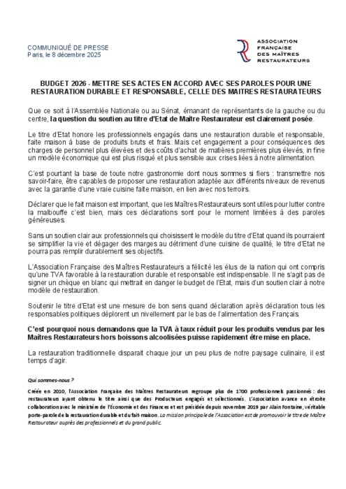 Le titre de Maître Restaurateur symbolise une restauration de proximité ouverte à tous, respectant l'agriculture française, la souveraineté alimentaire, une démarche autour de la transmission, la pertinence du geste et une restauration raisonnable et durable. Pour ce faire chaque Maître Restaurateur, chaque Maître Restauratrice engage et assume des frais et des charges en conséquence. A l'heure où la restauration traditionnelle, notre patrimoine, est en train de s'affaisser et de disparaître progressivement, il est temps de réagir maintenant.