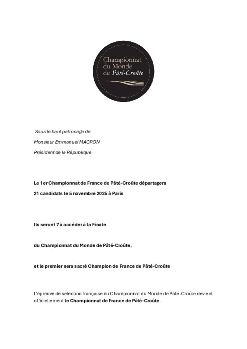 L’épreuve de sélection française du Championnat du Monde de Pâté-Croûte devient officiellement le Championnat de France de Pâté-Croûte. Cette sélection nationale réunira 21 candidats à La Samaritaine (Paris), parmi lesquels les 7 meilleurs iront en finale à Lyon. Le lauréat sera couronné Champion de France de Pâté-Croûte 2025.