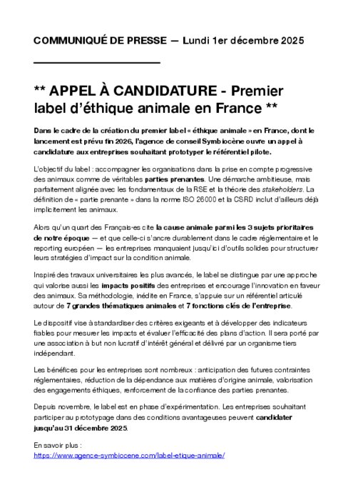 Métiers 01 décembre 2025 - 08:45 Dans le cadre de la création du premier label « éthique animale » en France, dont le lancement est prévu fin 2026, l’agence de conseil Symbiocène ouvre un appel à candidature aux entreprises souhaitant prototyper le référentiel pilote. PDF (31 Ko) Télécharger