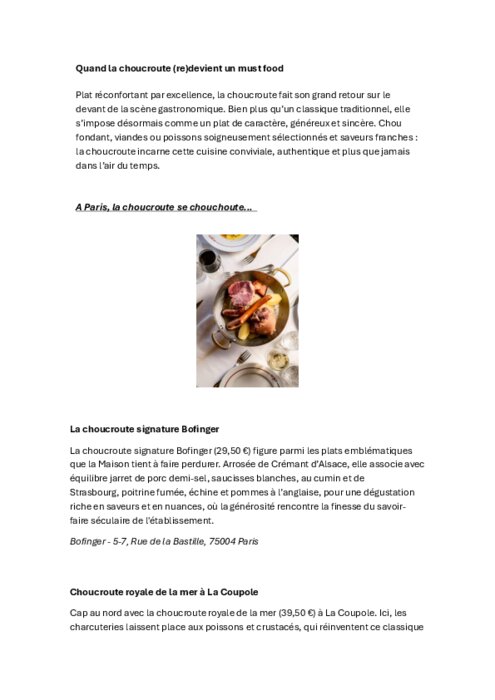 Plat réconfortant par excellence, la choucroute fait son grand retour sur le devant de la scène gastronomique. Bien plus qu’un classique traditionnel, elle s’impose désormais comme un plat de caractère, généreux et sincère. Chou fondant, viandes ou poissons soigneusement sélectionnés et saveurs franches : la choucroute incarne cette cuisine conviviale, authentique et plus que jamais dans l’air du temps.