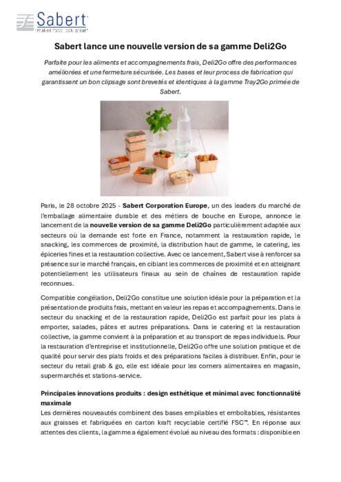 Sabert Corporation Europe, un des leaders du marché de l’emballage alimentaire durable et des métiers de bouche en Europe, annonce le lancement de la nouvelle version de sa gamme Deli2Go particulièrement adaptée aux secteurs où la demande est forte en France, notamment la restauration rapide, le snacking, les commerces de proximité, la distribution haut de gamme, le catering, les épiceries fines et la restauration collective. Avec ce lancement, Sabert vise à renforcer sa présence sur le marché français, en ciblant les commerces de proximité et en atteignant potentiellement les utilisateurs finaux au sein de chaînes de restauration rapide reconnues.
