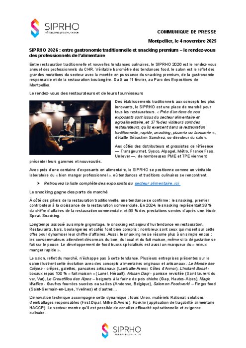 Entre restauration traditionnelle et nouvelles tendances culinaires, le SIPRHO 2026 est le rendez-vous annuel des professionnels du CHR. Véritable baromètre des tendances food, le salon est le reflet des grandes mutations du secteur avec la montée en puissance du snacking premium, de la gastronomie responsable et de la restauration boulangère. Du 9 au 11 février, au Parc des Expositions de Montpellier.