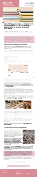 Du dimanche 25 au mardi 27 janvier 2026, Smahrt Toulouse revient au MEETT - Parc des Expositions de Toulouse pour sa 9e édition. Rendez-vous de référence du Grand Sud-Ouest, le salon rassemblera 300 exposants et marques autour d'une offre pensée pour les professionnels de la restauration, de l'hôtellerie et des métiers de bouche.