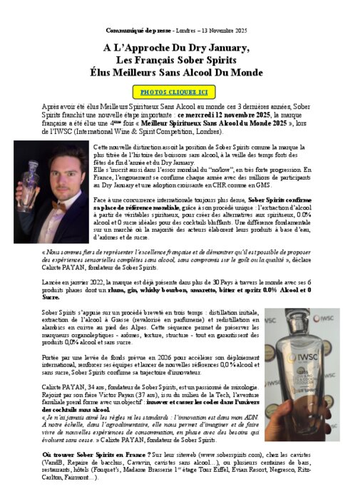 Cette nouvelle distinction assoit la position de Sober Spirits comme la marque la plus titrée de l’histoire des boissons sans alcool. Elle s’inscrit aussi dans l’essor mondial du “no/low”, en très forte progression. En France, l’engouement se confirme chaque année avec des millions de participants au Dry January et une adoption croissante en CHR comme en GMS.