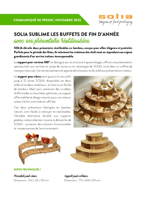 Solia dévoile deux présentoirs réutilisables en bambou, conçus pour allier élégance et praticité. Parfaits pour la période des fêtes, ils valorisent les créations des chefs tout en répondant aux enjeux grandissants d’un service traiteur écoresponsable.