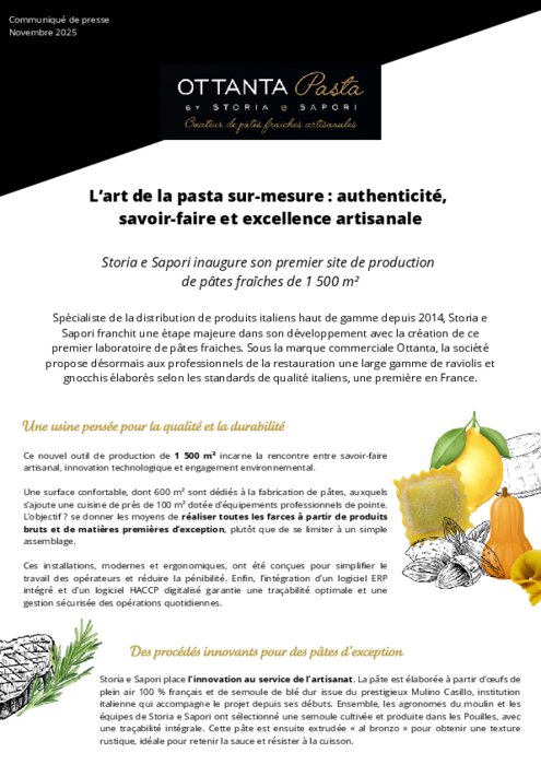 Spécialiste de la distribution de produits italiens haut de gamme depuis 2014, Storia e Sapori franchit une étape majeure dans son développement avec la création de son premier laboratoire de pâtes fraiches. Sous la marque commerciale Ottanta, la société propose désormais aux professionnels de la restauration une large gamme de raviolis et gnocchis élaborés selon les standards de qualité italiens, une première en France.