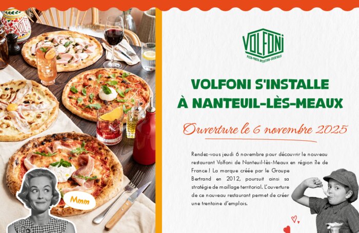 L’enseigne de restauration italienne Volfoni ouvre les portes de son nouveau restaurant à Nanteuil-lès-Meaux, au croisement de l’avenue François Tessan et de la rue du Typographe. La marque créée par le Groupe Bertrand en 2012 poursuit ainsi sa stratégie de maillage territorial. L’ouverture de ce nouveau restaurant permet de créer une trentaine d’emplois.