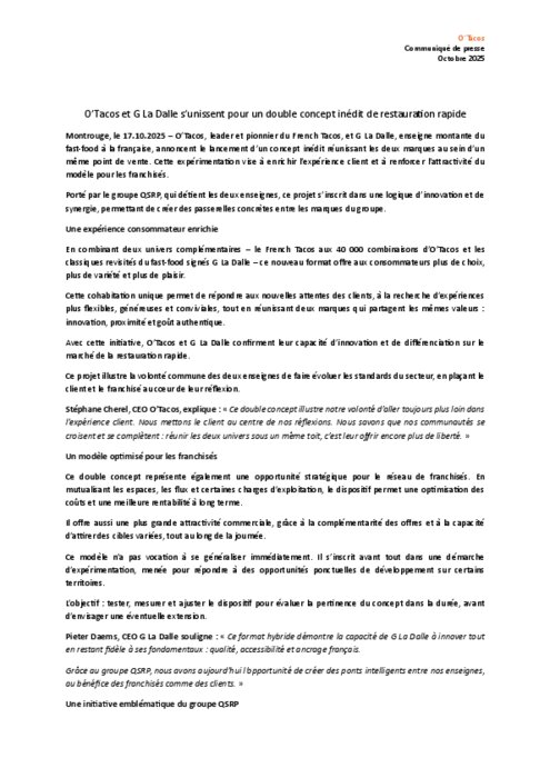 O’Tacos, leader et pionnier du French Tacos, et G La Dalle, enseigne montante du fast-food à la française, annoncent le lancement d’un concept inédit réunissant les deux marques au sein d’un même point de vente. Cette expérimentation vise à enrichir l’expérience client et à renforcer l’attractivité du modèle pour les franchisés.